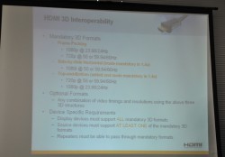 Venuti氏はHDMI 1.4が規格化された背景について、「本格的な3Dホームシアター、3Dゲームの普及を目的に09年6月リリースした。今年の3月には放送業界のニーズに応えるためVer.1.4aを立ち上げた」と説明。HDMIの3D対応については必須仕様のフォーマットが公開され、1.4から義務化された「Frame Packing方式」(1080p@23.98/24Hz、720p@50または59.94/60Hz)、Ver.1.4aから義務化された「Side-by-Side Half方式」(1080i@50または59.94/60Hz)、Ver.1.4aから追加・義務化された「Top-and-Bottom方式」」(1080p@23.98/24Hz、720p@50または59.94/60Hz)が挙げられている。ディスプレイ機器はこれら必須フォーマットの「全て」をサポートすることが要件となるほか、プレーヤーなどソース機器は「少なくとも1つ」を、リピーター機器は「各フォーマットを中継できる機能」を備えることなどが規定されている。なお、これらの必須フォーマットのほかに、各種ビデオタイミングと上記3種の3D伝送方式を使った任意の組み合わせもオプションフォーマットとして含まれて、メーカーは自らのニーズに応じて製品に適用することが認められている。