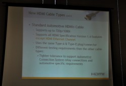 さらにVer.1.4から新設される車載用HDMI「Type E」コネクタの内容も紹介された。新たに提案された車載用接続システムは、カーエンターテインメントでのHD配信用に設計されており、過酷な自動車走行環境にも耐えうる頑強な接続仕様も実現できるよう、ロック付のコネクタが装備される点などが特徴だ。HDMIイーサネットチャンネルのサポートは含まれない。加えて標準の「Type A」プラグで接続するAV機器を、車内用のシステムに中継するための「Type A リレーレセプタクル」コネクタや、リレーケーブルの用途についても紹介が行われた。