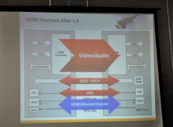 続いて「HDMIイーサネットチャンネル(HEC)」の説明が行われた。本機能はHD映像やオーディオ信号、コントロール信号といった従来のデータに加え、データ通信を1本のHDMIケーブルで統合して行うというもので、最大100Mbpsの転送スピードを実現し、HDMI経由でIPベースのアプリケーションが利用可能になる。