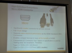 その他、HDMI 1.4の特徴としてVenuti氏からは4K2Kや新色空間への対応、オーディオリターンチャンネル機能なども紹介された。またコネクタの種類に標準(Type A)、ミニ(Type C)のほか、スマートフォンやデジタルカメラなどポータブルデバイス用途を想定してさらに小型化を図ったマイクロ端子(Type D)が、今後追加されていくことについても触れられた。