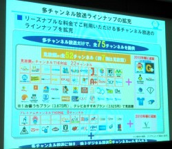 コンテンツの拡充については、多チャンネル放送のラインナップは5月新規追加分を含めて計75chを提供。そのうちHD対応チャンネルは専門チャンネルが30ch、これに地デジ放送9chを含めると最大39chを提供する。またVODサービスでもNHKオンデマンド、フジテレビ On Demand、明日24日より開始するTBSオンデマンドといった放送局コンテンツを充実させ、人気番組を配信。見逃し視聴の需要を伸ばしてきた。