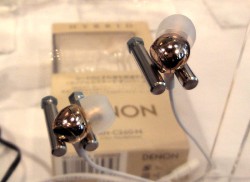 デノンは同社の主要ヘッドホン/イヤホンを展示スペースに所狭しと並べた。展示の中心となっているのはヘッドホンで、同社の最上位機「AH-D7000」や「AH-D5000」などの音を実際に確かめることができる。同社説明員によると、7000と5000のどちらにすべきかという来場者からの問い合わせが多いとのことだった。