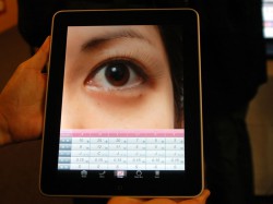 そして、オンラインゲームを中核へと育成する事業として位置続けるなど、メディア・エンタテインメント事業分野についても展望を発表。PC用オンラインゲームやモバイルゲームのデモを行うとともに、エンタテインメント事業の一角として、同社子会社のモーションポートレート(株)が開発を進めているiPad用アプリ「i Lash」も披露された。