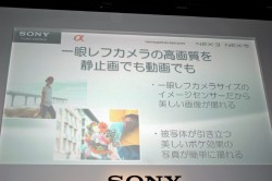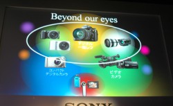 また「ソニーはレンズ、イメージセンサー、画像処理エンジンというデジタルカメラに欠かせない3つの技術を自主開発している。NEX-5、NEX-3もこれらの技術を集結させて完成した製品だが、さらに現在、NEXでも使用したExmor APS HD COMSセンサーを搭載したレンズ交換式フルHDビデオカメラを開発しているところ」と今後の展開も紹介。ビデオカメラはAVCHD方式を採用し、マウントアダプタを介してAマウントレンズも使用できる仕様となる(関連ニュース)。動画も静止画も目に見えるもの以上の感動を与えたいという思いが込められた“Beyond our eyes”というコンセプトのもと、今後もデジタルカメラ、ビデオカメラ分野で魅力的な製品を開発していくと宣言した。