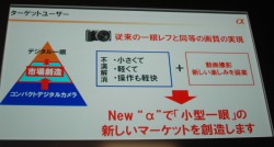 質疑応答では記者から国内外での販売目標について質問が及んだが、今村氏は「まず業界全体を成長させていきたいということが第一。この小型一眼という領域は必ずマーケットがあると信じている。どのくらいこの市場が伸びるかという予測は非常に難しいが、従来の一眼レフ市場以上に市場全体をのばした上で、その中の15%のシェアはソニーが獲得していきたい」と回答した。