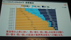 国内デジタルカメラの出荷数は、2007年度に1,700万台の出荷を記録して以降、出荷数は前年度割れとなっており、下野氏は「魅力的な製品を発売し、デジカメの業界全体を活性化させることが急務」と強調する。さらにコンパクトデジカメにおいては、普及率の上昇に伴い、年々新規購入者より買い換え・買い増しの比率が上がり、2009年8月時点で8割に達しているという同社の調査結果をふまえ、「NEX-5」「NEX-3」ではコンパクトデジカメからの買い換えユーザーをターゲットにしたと説明する。