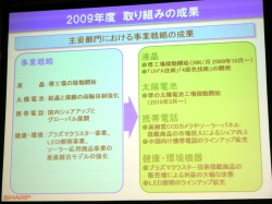 片山氏はまず、2009年度の取り組みの成果について報告。2008年度に同社初の赤字となったことを受けて緊急業績改善対策を実施した結果について説明し、総経費を2,000億円削減するという対策については、目標を上回る2,138億円の経費削減を実現したと述べ、また液晶や太陽電池で新たなビジネスモデルを導入するという対策については、「液晶は中国での液晶パネル生産プロジェクト受注・契約の調印にこぎつけることができた」と評価した。