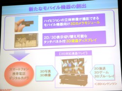 そのほか、先日開発をアナウンスした3Dカメラモジュールについても紹介。「視差バリア方式の裸眼3D液晶ディスプレイと組み合わせれば、1台でハイビジョン3D撮影を行ってその場で見ることができる。もちろん3D液晶テレビと接続すれば、メガネを使って大画面の3D視聴が可能になる」と、その可能性の高さを訴求した。