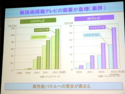 さらに片山氏は、LEDバックライト搭載液晶テレビや3Dテレビの需要が急増していることも指摘。LEDテレビ、3Dテレビともに、調査機関が需要予測を最近になって大幅に見直したことを紹介し、「LEDテレビや3Dテレビへの期待は予想以上の勢いで高まっている。これらの製品には高性能パネルが必要のため、品不足はさらに強まるだろう」と予測した。