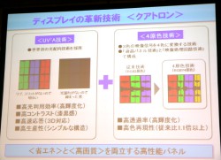 液晶テレビ事業については、同社が今後拡販に力を入れていく技術として「クアトロン」を紹介。クアトロンとは、世界初の光配向技術を採用した「UV2A」と、RGBにYを加えた4つのサブピクセルで映像を作り出す「4原色技術」を融合させたもので、ネーミングには「4」を表すQUADと、電子のTRONを組み合わせた。