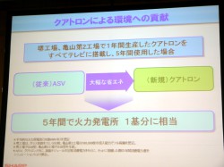 クアトロンでどれだけ消費電力を実現できるかということについても片山氏は説明し、「たとえば、堺工場と亀山第2工場で1年間のあいだに生産するクアトロンをすべてテレビに搭載し、5年間使用した場合、ASV液晶に比べて火力発電所1基分の消費電力が削減できる」と例を示した。