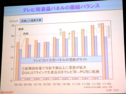 まず同氏は液晶パネルの需給状況について「液晶テレビ用のパネル需要は堅調に推移すると見ている。また需給状況についても、来年前半には供給過多となるという見方があったが、新興国市場で当初予測以上に需要が拡大していること、海外のG6、G7ラインがテレビ用からPC用に転換していることなどから、既存のG8ラインに液晶テレビが集中する傾向が今年から来年にかけて強まる」と説明。さらに「海外メーカーの工場やラインの立ち上げも遅れ気味になっている。パネルの品不足は続くだろう」と述べた。