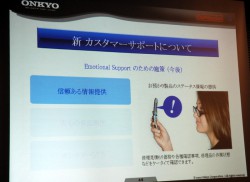 さらに砂長氏は、検討中の新サービスとして、オンキヨーダイレクトで購入した製品には3年間長期保証を標準で付けるサービスを早期に実現するとしたほか、店頭で購入した製品も、申し込むことで長期保証が受けられる保証制度についても早期実現を目指すと表明。これら以外にもパソコンのアップグレードやデータ消去、サポート予約など、よりユーザーの視点に立ったサービスを随時実施していく、と説明した。