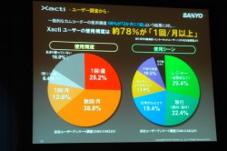 豊田秀樹氏同社のアンケートによると、使用頻度が一般的なビデオカメラのユーザーの68%が「2ヶ月に1回」と回答下のに対し、Xactiユーザーの約78%が「1ヶ月に1回以上」と回答。また使用シーンについても一般的なビデオカメラのユーザーの大半が子供の成長や入学式などのセレモニーと特別なイベントでの利用を挙げるのに対し、Xactiユーザーではレジャー(29.4%)、旅行(22.4%)、日常のひとコマ(19.4%)と多様なシーンで活用しているという回答が得られたという。これらの結果を受け「Xactiのコンセプトが受け入れられていると考えている」と豊田氏は自信をみせる。