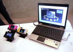また受信端末についても、1チップでMediaFLOとワンセグに両対応できるチューナーを開発したほか、USBでPCに接続するチューナーや、受信した映像をWi-FiでiPhoneなどに転送できるチューナーなども既に開発中であると述べた。会場にはこれらの機器のほか、北米ですでに発売されているMediaFLO対応携帯電話なども展示され、実際に試用することができた。