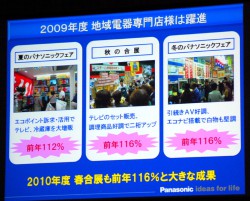 国内家電市場については、エコポイント効果と販売店の尽力によって市場最高の販売記録を達成したと紹介。春の合展でも116%の成果を挙げており、その勢いを堅持するべく、ともに頑張りたいとした。