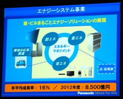 “GT12"の詳細では、創エネ、蓄エネ、省エネ、さらにエネルギーマネージメント(制御)の4つを核に家・ビルまるごとのエナジーソリューション実現を目指す。これをエナジーシステム事業として年率16%の成長を目指し、2012年度売り上げ目標合計8,500億円とした。