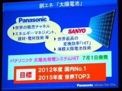 創エネ事業としての太陽電池は、サンヨー電機と一体ですすめ販売態勢も強化。第一弾はすでに発表されているパナソニック太陽光発電システム「HIT」で、販売店の協力をあおぐ。2015年 世界トップ3販売を視野に、2012年度国内ナンバーワンをめざす。