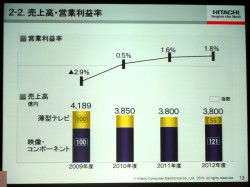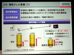 薄型テレビについては、国内へ開発リソースを集中させて安定的な黒字化を実現するほか、調達品も活用することが基本戦略。また国内市場戦略では、総需要における日立商品のカバー率を2009年の38%から2012年には98%まで高め、シェアについても2009年の6.0%から2012年には7.5%まで高める考えだ。