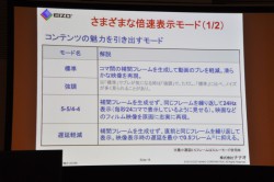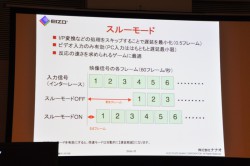 ほかにもI/P変換などの処理をスキップすることで遅延を最小0.5フレームまで抑えられる「スルーモード」を搭載。本モードはビデオ入力のソースにのみ有効に働き、スルーモードをONにすると倍速モードは自動的に「遅延軽減」に設定される。