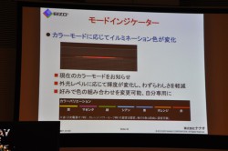 カラーモードは画面に表示するコンテンツに合わせてPower/ゲーム/スタンダード/シネマの4種類に、ユーザーが自由にカスタマイズできるカスタムモードを加えた5種類から選べる。選択されたカラーモードに合わせて、パネル前面のイルミネーションバーが7色に変化するギミックも用意されている。モードごとの色設定はユーザーが任意に設定でき、明るさも外光に合わせて3段階に調整できる。