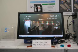 エスケイネットは、今年4月に発売したビデオキャプチャーユニット「Monster X2」2枚と市販のカメラなどを組み合わせた3D映像表示デモを行っている。