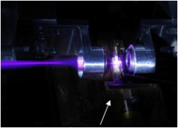 青紫色超短パルス半導体レーザー発振の様子。矢印部分は光半導体増幅器
