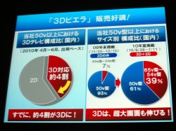 なお、発表会では同社の50V型以上のテレビにおいてすでに約4割を3Dモデルが占めるようになっていること、3Dモデルを投入した2010年の夏商戦では2009年の年末商戦に比べ大型サイズの構成比が増加したことなども発表。3D VIERAの販売が非常に好調に推移していることなども明かされた。