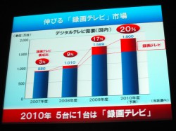 また、録画機能付きテレビについても2010年には約20パーセントの構成比を占めるようになるとの予測を発表。「新規に購入される5台に1台は録画テレビというホットな市場だ」と、録画テレビ市場が急速に伸びていることを説明し、今回の新製品開発の背景を語った。