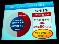 まず、今後発売予定の42V型以上のVIERAは、全機種を3D対応にする(ただし一部機種を除く)ことを表明。50万台以上規模になると同社が予測する2010年度の国内3Dテレビ市場で、シェア50%以上を目標とすることも明らかにした。