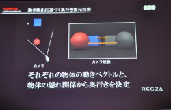 新しいCELL REGZAでは、高精度な2D-3D映像変換を実現するために3つの独自技術が採用されている。一つめとなる「モーション3D」は動き検出に基づく奥行き復元技術。画面に表示されている物体の前後ベクトル情報と、物体の隠れ関係から画面上を複雑に動き回る被写体の奥行きを正確に再現する。二つめの「ベースライン3D」は、画面4隅の色ヒストグラムを抽出し、学習された約1,400枚のサンプル画像から入力映像の「構図」を比較推定し、奥行きを割り当てる技術。三つめの技術となる「フェイス3D」では、入力映像から「人物の顔位置」を検出し、これを基準に人型の奥行きデータを割り当て、特に人物の顔も立体感のある映像をつくり出すというもの。本技術には東芝独自の高速・高精度な顔検出技術が応用されているという。