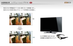 基本的な高画質3D再生のための機能は、CELL REGZA「X2/X2E2」シリーズ(関連ニュース)に搭載された基幹技術の一部が継承されている。「3D超解像技術 レゾリューションプラス5」を搭載し、サイド・バイ・サイド方式の3D映像については、水平方向画素のスケーリングを行い、3Dに最適化した映像を表示する。垂直方向の解像度がフルHDに満たない720pの3D映像信号が入力された際には超解像処理を加え、垂直方向の画素を復元した高精細な3D映像を再現する。