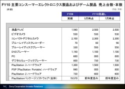 主要製品の当四半期での売上台数は、液晶テレビが510万台、ビデオカメラが140万台、コンパクトデジタルカメラが600万台、PCが190万台。2010年度全体での売上台数見通しは、液晶テレビが2,500万台、ビデオカメラが530万台、コンパクトデジタルカメラが2,300万台、PCが880万台と予想している。なお、PS3の当四半期の売上台数は240万台。2010年度で1,500万台の売上を予想している。