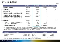 ソニーは、2010年度第1四半期の連結業績を発表。営業損益で670億円の利益を計上し、四半期純損益も黒字転換。当四半期は257億円の利益を計上したことなどを明らかにした。