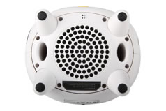 「KT1」は、31mm径のスピーカーを両耳部に、88mm径のウーファーを本体下部に内蔵した2.1chのiPodオーディオシステム。出力は左右スピーカーが各2.5W、ウーファー部が6W。音が360度に広がるように筐体が設計されており、設置位置を自由に選択できる点も利点という。