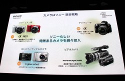 新たな需要創造の、2つ目の柱がカメラの総合戦略。「動画/静止画に境界のない時代」というスライドを背景に栗田氏は、「サイバーショットやNEX、α55/33など、特徴あるカメラを続々投入している。『やりたいこと』からカメラを探すユーザーが増えている」と述べ、豊富なラインナップを用意することで「カメラはソニー」というイメージを訴求していく考えを強調した。