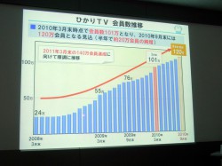 「ひかりTV」のサービス加入会員者については、2010年3月末時点で101万件となり、9月末には120万件の会員に到達することが見込まれている。直近の半年間では約20万会員の純増となり、同社が目標としてきた2011年3月末の140万会員達成に向け、順調にその数を伸ばしてきている。