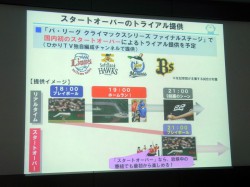 その他の試みとして、生放送コンテンツの「スタートオーバー」をトライアル提供する。同サービスは、今秋のプロ野球の「パ・リーグ クライマックスシリーズ ファイナルステージ」の放送にて実験的に行われる。ひかりTVサービスのホストサーバーに生放送中の番組を録画しておき、サービス利用者にVOD機能を通じて提供。試合が始まってからでも追いかけ再生をしながら、放送開始後の試合をテレビ観戦できる使い勝手を提供する。スタートオーバーのコンテンツは、番組放送中であればいつでも視聴を開始できる。画質は通常の地上デジ放送と同等のクオリティになる。今回は試験的に実施されるスタートオーバーのサービスだが、板東氏は「ユーザーニーズが高いようであれば、成長するサービスモデルに成り得るだろう」とコメントした。