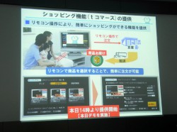 映像配信以外にも、IPTVサービスによるライフスタイルの拡充も図る。まず、本日14時からショッピング機能が追加された。同サービスはテレビのリモコンだけで簡単にショッピング(tコマース)が楽しめるというもの。サービスの特徴は、ユーザーがショッピングを行う際に、住所や決済方法について、既にひかりTVの契約時に登録した情報がそのまま利用できるため、リモコンによる事前登録操作が要らず、より“かんたん”な操作性を実現している点だ。サービス開始当初は「ひかりTVを快適に利用していただくためのAV機器や通信機器など、商品を中心に割安な価格でご提供していく」という。またサービスの反響次第で、将来的には外部通販会社との連携も検討する。板東氏は「サービスイン当初はトライアルなので商品がまだ少ないが、将来的にはもう少し大きなビジネスにしていきたい。今年度中にはテレビ通販の会社と組みたい。より商品を充実させ、テレビのリモコン一つで買える利便性を追求しながら女性ユーザーを増やせて行ければよいと思う」と述べた。
