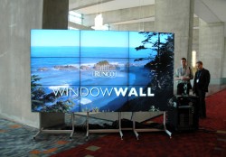 出色のソリューションは、巨大な映像の壁が目を引くWINDOW WALL。薄型の液晶パネルを自由に組み合わせることが可能で、環境映像を流してインテリア的に使ったり、スポーツや映画を大画面で楽しめるほか、テレビ会議にも使用できる。プロセッサー部はパネルと分離しており、放熱やノイズの問題を解消したという。