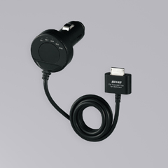 【SPEC】 ●変調方式:FMステレオ変調 パイロットトーン方式 ●コネクタ形式:WMポート ●送信周波数:87.1/87.7/88.3/88.9MHz ●ケーブル長:約60cm ●外形寸法:本体25W×16H×10Dmm(ケーブル、突起部含まず)、シガープラグ部分38W×70H×38Dmm(ケーブル、突起部含まず) ●質量:約45g