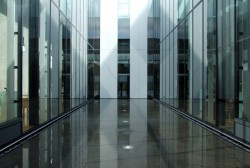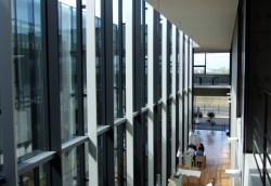 内部に入ると、開放的で明るくモダンな空間が目をひく。新社屋の中心には「水盤」が配置されており、その水盤に面した周囲の建築物の壁は、全面ガラスで構成されている。建物の内部に十分に光を取り込むことで、明るく開放感あふれる内部空間を構成するとともに、刻々と変化する光や雲がガラスに映り込み、あたかも美術館の中に入り込んだような錯覚に陥いる。