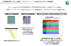 両機は、インテグラルイメージング方式とレンチキュラーシートを組み合わせたグラスレス3D専用LED液晶パネルを搭載し、裸眼での3D視聴に対応しているのが大きな特徴。液晶パネルは、サブピクセルを斜めに配置し、横9個×縦3個で1画素とする新画素構造と垂直レンチキュラーシートを合わせることで、鮮鋭感があり、輝度ムラの少ない3D映像を実現するとのこと。さらに、画面中央と画面端の光線の向きを変えることにより、視聴範囲を広げているという。