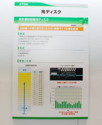 今回のサンプルディスクはBlu-rayの技術をベースに開発されており、読み取り/記録に用いるレーザーの仕様など、BDの延長線上にある技術が応用できる点も特徴。データの記録速度は、現在の時点ではBDディスクの1倍速程度のスピードだが、「今後レーザーパワーや記録感度を調整することでスピードアップは可能」(展示説明員)であるという。ディスクの用途としてはデータアーカイブやAV/IT、放送業務での活用が想定されているという。TDKではこのディスクの商品化も視野に入れながら「超多層記録光ディスク」の開発を続けていく考えだ。
