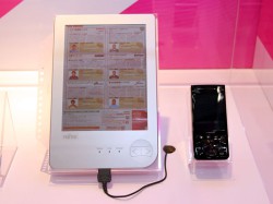 また、NTTドコモによる同放送用チューナー搭載型モバイルWi-Fiルーター「BF-01B」などの製品群も参考展示。富士通(株)によるカラー電子ペーパー端末の試作機に携帯電話を接続し、ケータイアプリを使ってのコンテンツ転送イメージなども披露されている。