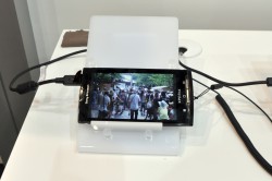 磁界が発生している充電台に、コイル入りバッテリーを内蔵した携帯電話やデジタル機器を置くだけで充電が可能な技術「Qi」も登場した。これまでワイヤレス充電は充電台の決められた位置に置かなければできなかったが、Qiは充電台の上であればどこでも充電でき自由度が高いのが特徴。通常のケーブル接続充電時と比べても、充電時間は変わらないという。
