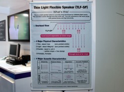 「TLF-SP(Thin-Light-Flexible Speaker)」は、同社が早稲田大学の山崎芳男教授の基本アイディアを元に独自に開発した1.5mm厚の薄型・軽量(A0サイズで約400g)の静電スピーカー。全体が柔構造で形状も自由にでき、巻いて運べるほか、全体を包むケーシング材(布など)に自由に印刷が可能。