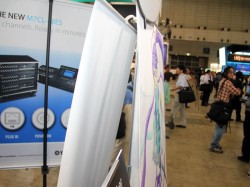 会場では同スピーカーと、デジタル情報を音響信号に変調して伝送する独自音響データ通信技術「INFOSOUND」を組み合わせた「サウンドサイネージ」のモデルケースとして製品を展示。「初音ミク」や「がくっぽいど」などのボーカロイドが音声を発する“音の出るポスター”を見ることができる。