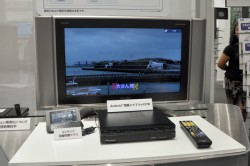 Android搭載搭載ハイブリッドSTBとスマートフォンを連携させ、家でも外出先でも便利にコンテンツを視聴する技術が参考展示されていた。まず、録画した番組をAndroid搭載タブレットやスマートフォンに自動転送しておく。すると、例えば家のテレビで途中まで視聴した番組の視聴完了位置を動画プレーヤーアプリが保持し、再生位置をタブレットやスマートフォンにWiFi経由で瞬時に送ることができる。例えば朝の忙しい時間でも、前夜に見たドラマの視聴完了位置をサッと転送して、電車のなかで続きを見る…というスタイルが可能になるわけだ。