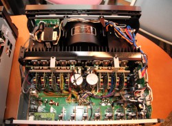 「PR-SC5508」は実用最大出力280W(6Ω)×9chのマルチチャンネルパワーアンプ。筐体内部は、ヒートシンクでパワーアンプ部と電源回路部が分断されている。